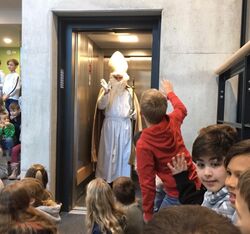 Als der Chor „Lasst uns froh und munter sein“ anstimmte, hört dies wohl der Nikolaus, denn dieser ließ es sich nicht nehmen und kam zur Adventsfeier – auf sehr untraditionelle Art – mit dem Aufzug. Nachdem für den Nikolaus ein Gedicht aufgesagt wurde, musste er sich schon wieder verabschieden. Das Lied „Feliz navidad“ rundete die gelungene Feier ab.