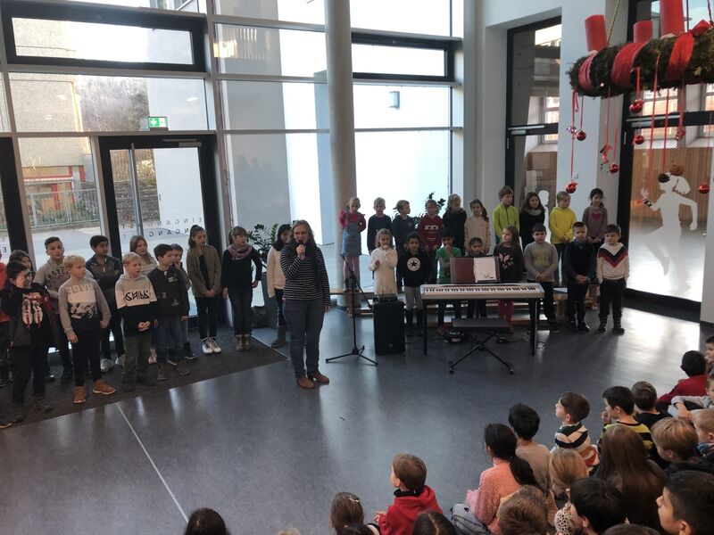 Der Chor singt unter der Leitung von Heike Schreckenhöfer weihnachtliche Lieder und eine Klassenstufe macht einen Auftritt.