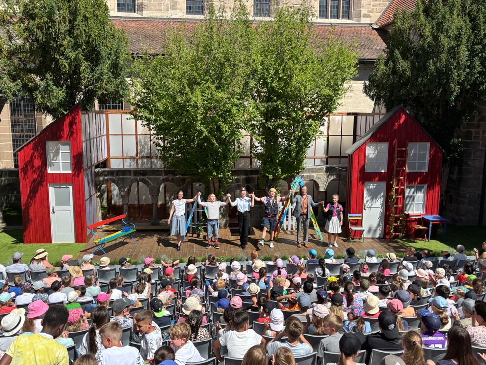 Ein besonderes Erlebnis wartete auf alle Klassen der Primarstufe: Gemeinsam machten sie sich mit dem Bus auf den Weg nach Feuchtwangen, um dort im Freilichttheater der Kreuzgangspiele das spannende Theaterstück „Meisterdetektiv Kalle Blomquist“ zu erleben.