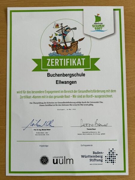 Die Buchenbergschule Ellwangen ist nun offiziell Teil des baden-württembergischen Präventionsprogramms „Komm mit in das gesunde Boot“ in Kooperation mit der Uni Ulm. Mit der erfolgreichen Zertifizierung setzt die Grundschule ein klares Zeichen für mehr Gesundheitsförderung im Schulalltag.
